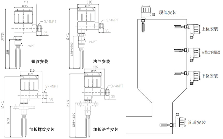 二、音叉物位開關(guān)外形尺寸圖及安裝示意圖: