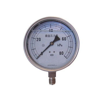 膜盒耐震壓力表由測量系統(tǒng)(包括接頭膜盒等)、傳動機構、指示裝置和外殼組成。當被測介質的壓力作用于膜盒時,其自由端產生相應彈性變形一位移,經撥桿帶動傳動機構放大,由指示裝置將被測壓力在儀表盤上指示出來,且表內充油,達到耐震的效果。
