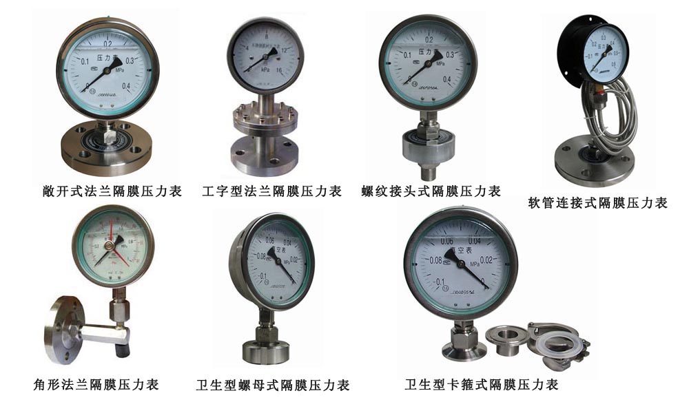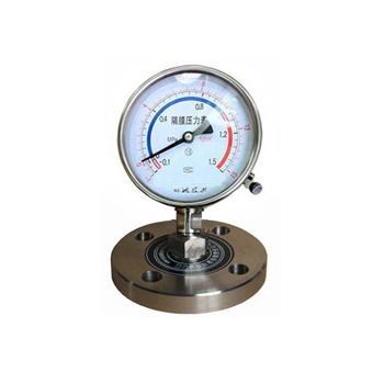 隔膜式壓力表由各種通用型壓力儀表和不同結(jié)構(gòu)的隔膜隔離器組成一個封閉系統(tǒng),內(nèi)充密封液。當被測介質(zhì)的壓力作用于隔膜時,則隔膜產(chǎn)生變形,壓縮封閉系統(tǒng)中的密封液。由于密封液的固有性質(zhì),使壓力儀表中的彈性元件產(chǎn)生相應的彈性變形—位移,經(jīng)指示裝置顯示壓力值。當隔膜的剛度足夠小時,則壓力儀表指示的壓力就近于被測介質(zhì)的壓力值。