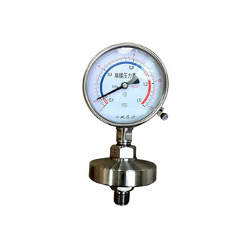 螺紋式隔膜壓力表由各種通用型壓力儀表和不同結構的隔膜隔離器組成一個封閉系統,內充密封液。當被測介質的壓力作用于隔膜時,則隔膜產生變形,壓縮封閉系統中的密封液。由于密封液的固有性質,使壓力儀表中的彈性元件產生相應的彈性變形—位移,經指示裝置顯示壓力值。當隔膜的剛度足夠小時,則壓力儀表指示的壓力就近于被測介質的壓力值。